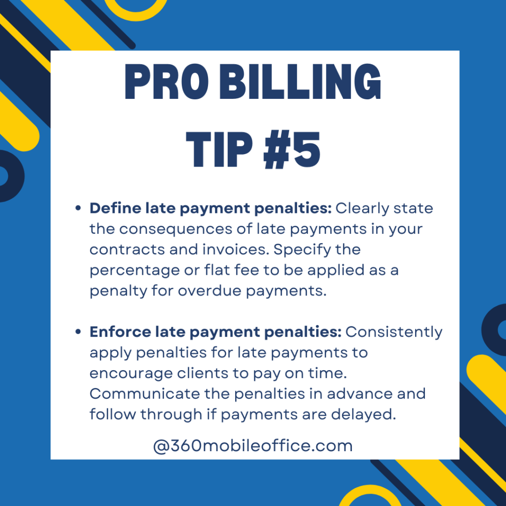 Including late payment penalties in your invoices can serve as a deterrent to late payments and encourage timely settlements. Clearly define the late payment penalties in your contract and invoices, including the amount or percentage to be applied and the grace period before penalties take effect.