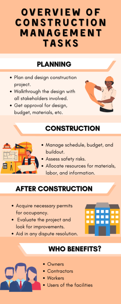 Construction management is a valuable tool for clients in stakeholders when it comes to the construction of a building. Construction management is the process of developing, planning, designing, and overseeing a construction project. This is the lead person that manages all the facets of a construction job.